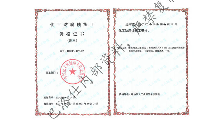 在工業(yè)清洗領(lǐng)域,巴洛仕擁有工業(yè)設(shè)備化學(xué)清洗A級、儲罐機(jī)械清洗A級等四項A級資質(zhì),以及化工防腐蝕施工一級資質(zhì)(兼清洗一級),能夠滿足化工企業(yè)從設(shè)備開車前清洗、日常檢修清洗到拆除前置換清洗的全周期需求?;し栏g施工一級資質(zhì)使巴洛仕能夠為化工設(shè)備、管道、儲罐提供專業(yè)的防腐蝕施工服務(wù),有效延長設(shè)備使用壽命。